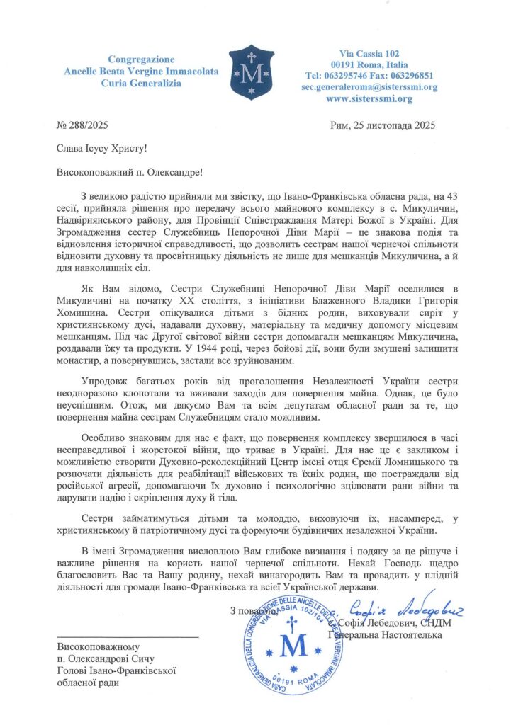 Також вона передала голові обласної ради лист-подяку від Генеральної Настоятельки Сестер Служебниць Непорочної Діви Марії сестри Софії Лебедович. У зверненні висловлено вдячність за важливе та принципове рішення, ухвалене на користь чернечої спільноти.
